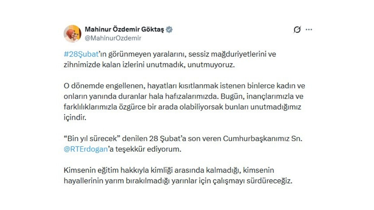 Mahinur Özdemir Göktaş, sosyal medya hesabından yaptığı paylaşımda 28 Şubat sürecinin toplumda bıraktığı etkileri hatırlattı. Mesajında şu ifadeleri kullandı: