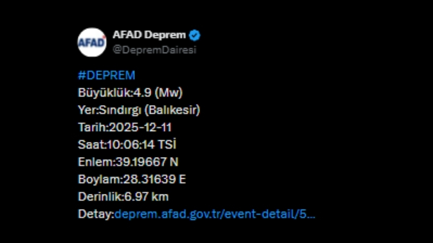 AFAD’ın resmi internet sitesinde yer alan bilgilere göre, 11 Aralık 2025 tarihinde saat 10:06’da Balıkesir’in Sındırgı ilçesinde 4.9 büyüklüğünde bir deprem meydana geldi.