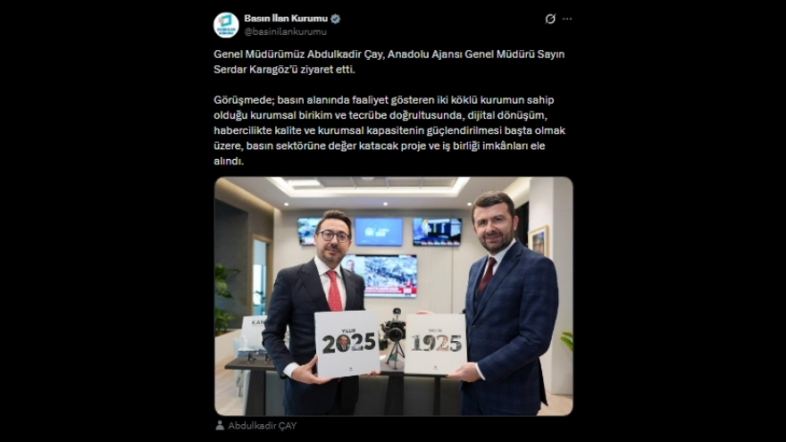 “Genel Müdürümüz Abdulkadir Çay, Anadolu Ajansı Genel Müdürü Sayın Serdar Karagöz’ü ziyaret etti. Görüşmede; basın alanında faaliyet gösteren iki köklü kurumun sahip olduğu kurumsal birikim ve tecrübe doğrultusunda, dijital dönüşüm, habercilikte kalite ve kurumsal kapasitenin güçlendirilmesi başta olmak üzere, basın sektörüne değer katacak proje ve iş birliği imkânları ele alındı.”