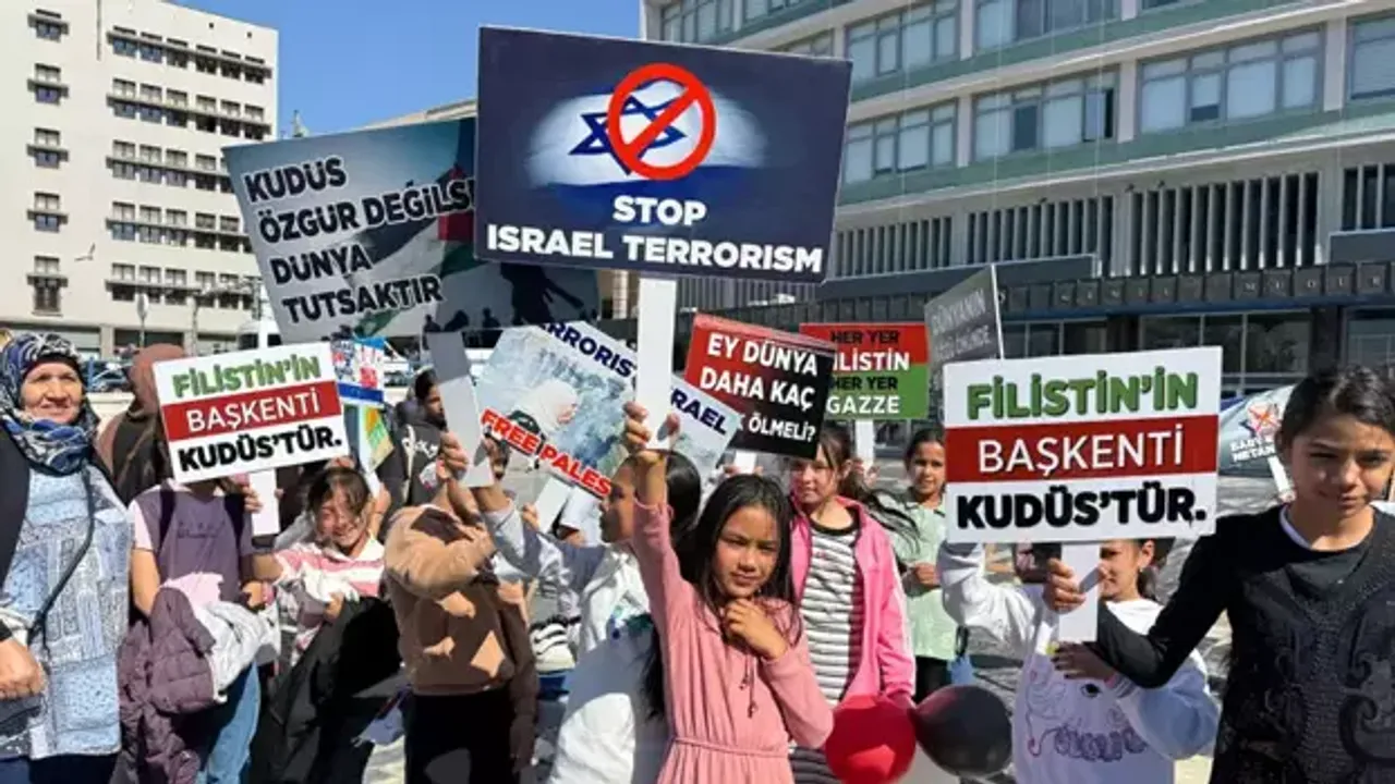 Çocukların taşıdığı “Her yer Filistin, her yer Gazze”, “Filistin’in başkenti Kudüs’tür” ve “Kudüs özgür değilse, dünya tutsaktır” yazılı pankartlar meydanda açıldı.