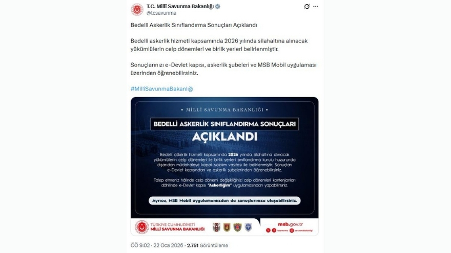 MSB, bedelli askerlik hizmeti kapsamında sonuçların doğru ve güncel bilgiler içerdiğini vurgulayarak, "Bedelli Askerlik Sınıflandırma Sonuçları Açıklandı. Bedelli askerlik hizmeti kapsamında 2026 yılında silahaltına alınacak yükümlülerin celp dönemleri ve birlik yerleri belirlenmiştir. Sonuçlarınızı e-Devlet kapısı, askerlik şubeleri ve MSB Mobil uygulaması üzerinden öğrenebilirsiniz" ifadelerini kullandı.