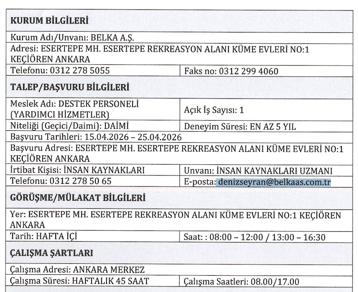 BELKA Ankara, merkez biriminde çalıştırmak üzere destek personeli alacağını duyurdu. İŞKUR üzerinden yayımlanan resmi ilana göre alınacak kişi daimi kadroda istihdam edilecek.