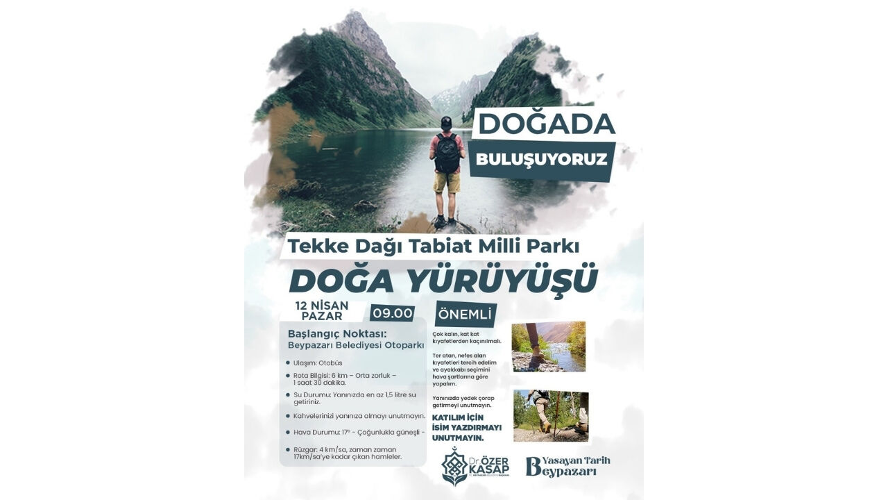 Belediyenin sosyal medya hesabından yapılan açıklamada etkinliğin Tekke Dağı Tabiat Milli Parkı’nın eşsiz doğasında gerçekleştirileceği belirtildi. Katılımcıların temiz hava ve huzurlu bir ortamda keyifli bir yürüyüş deneyimi yaşayacağı ifade edildi.