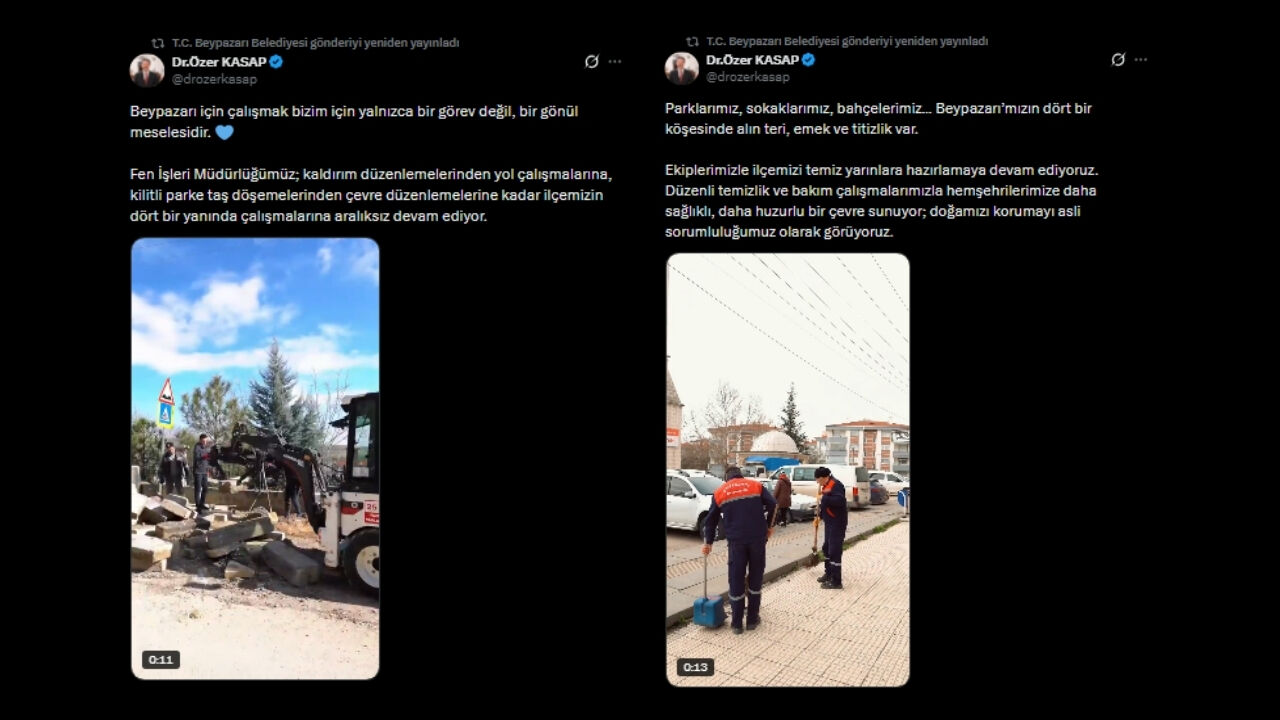 Beypazarı Belediyesi, ilçede yürüttüğü kapsamlı temizlik ve düzenleme çalışmalarıyla dikkat çekiyor. Başkan Özer Kasap, “Parklarımız, sokaklarımız, bahçelerimiz… Beypazarı’mızın dört bir köşesinde alın teri, emek ve titizlik var” diyerek ekiplerin özverili çalışmalarını vurguladı. Fen İşleri Müdürlüğü ise kaldırım ve yol düzenlemelerinden çevre düzenlemelerine kadar ilçeyi yenilemeye devam ediyor.