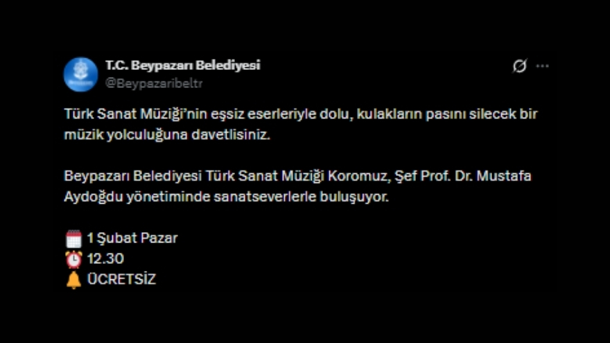 Beypazarı Belediyesi, sosyal medya hesapları üzerinden yaptığı paylaşımla sanat dolu bir buluşmanın müjdesini verdi. Paylaşımda, "Türk Sanat Müziği’nin eşsiz eserleriyle dolu, kulakların pasını silecek bir müzik yolculuğuna davetlisiniz" ifadelerine yer verildi.
