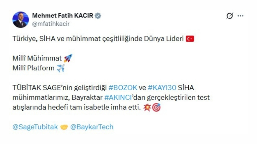 Bakan Kacır açıklamasında, "Türkiye, ve mühimmat çeşitliliğinde dünya lideri. Milli mühimmat ve milli platform. TÜBİTAK SAGE’nin geliştirdiği BOZOK ve KAYI30 SİHA mühimmatlarımız, Bayraktar AKINCI’dan gerçekleştirilen test atışlarında hedefi tam isabetle imha etti" ifadelerine yer verdi.