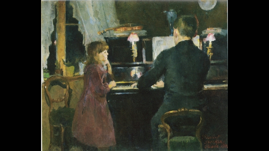 Harriet Backer bu tabloda gün ışığını bilinçli olarak dışarıda bırakır. Pencerenin hemen dışında karanlık hakimdir. İç mekanı aydınlatan tek kaynak, piyano üzerindeki lambaların solgun ışığıdır.