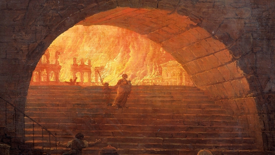 Fransız ressam Hubert Robert’ın 1787 tarihli Büyük Roma Yangını tablosu, Roma’nın M.S. 64’te haftalarca süren büyük yangınını hem tarihsel hem duygusal bir bakışla ele alıyor.