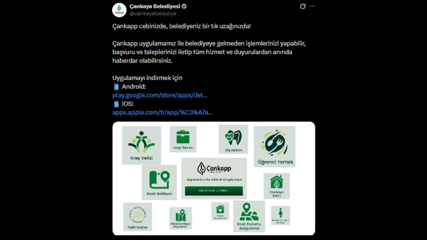 Çankaya Belediyesi, dijital hizmetlerini mobil ortama taşıyan uygulamasıyla vatandaşların belediye işlemlerine daha hızlı erişmesini hedefliyor. Sosyal medya üzerinden yapılan duyuruda, belediye hizmetlerine fiziksel olarak gitmeden ulaşmayı sağlayan mobil uygulamanın sunduğu kolaylıklar paylaşıldı. Başvuru, talep ve duyurulara anında erişim imkanı sunan sistemle, günlük işlemlerin daha pratik hale gelmesi amaçlanıyor.