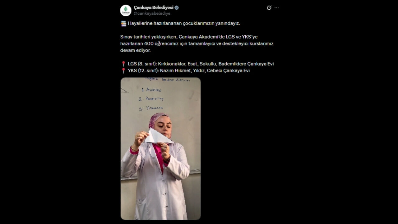 "Hayallerine hazırlananan çocuklarımızın yanındayız.Sınav tarihleri yaklaşırken, Çankaya Akademi’de LGS ve YKS’ye hazırlanan 400 öğrencimiz için tamamlayıcı ve destekleyici kurslarımız devam ediyor. LGS (8. sınıf): Kırkkonaklar, Esat, Sokullu, Bademlidere Çankaya Evi YKS (12. sınıf): Nazım Hikmet, Yıldız, Cebeci Çankaya Evi"