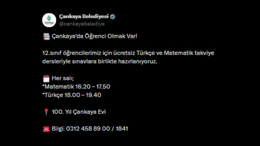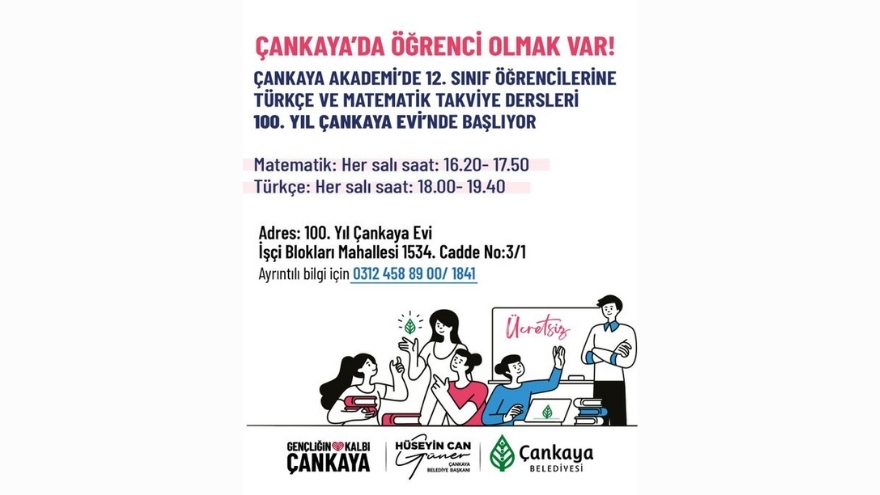Çankaya Belediyesi, lise son sınıf öğrencilerine yönelik sınav desteği veriyor. “Çankaya’da Öğrenci Olmak Var” sloganıyla hayata geçirilen eğitim destek programı kapsamında, Türkçe ve Matematik branşlarında ücretsiz takviye dersleri veriliyor.