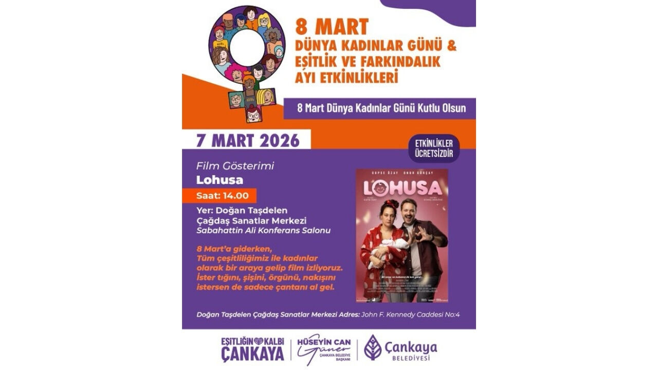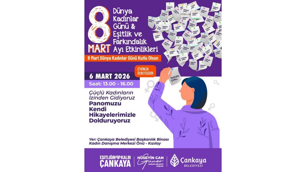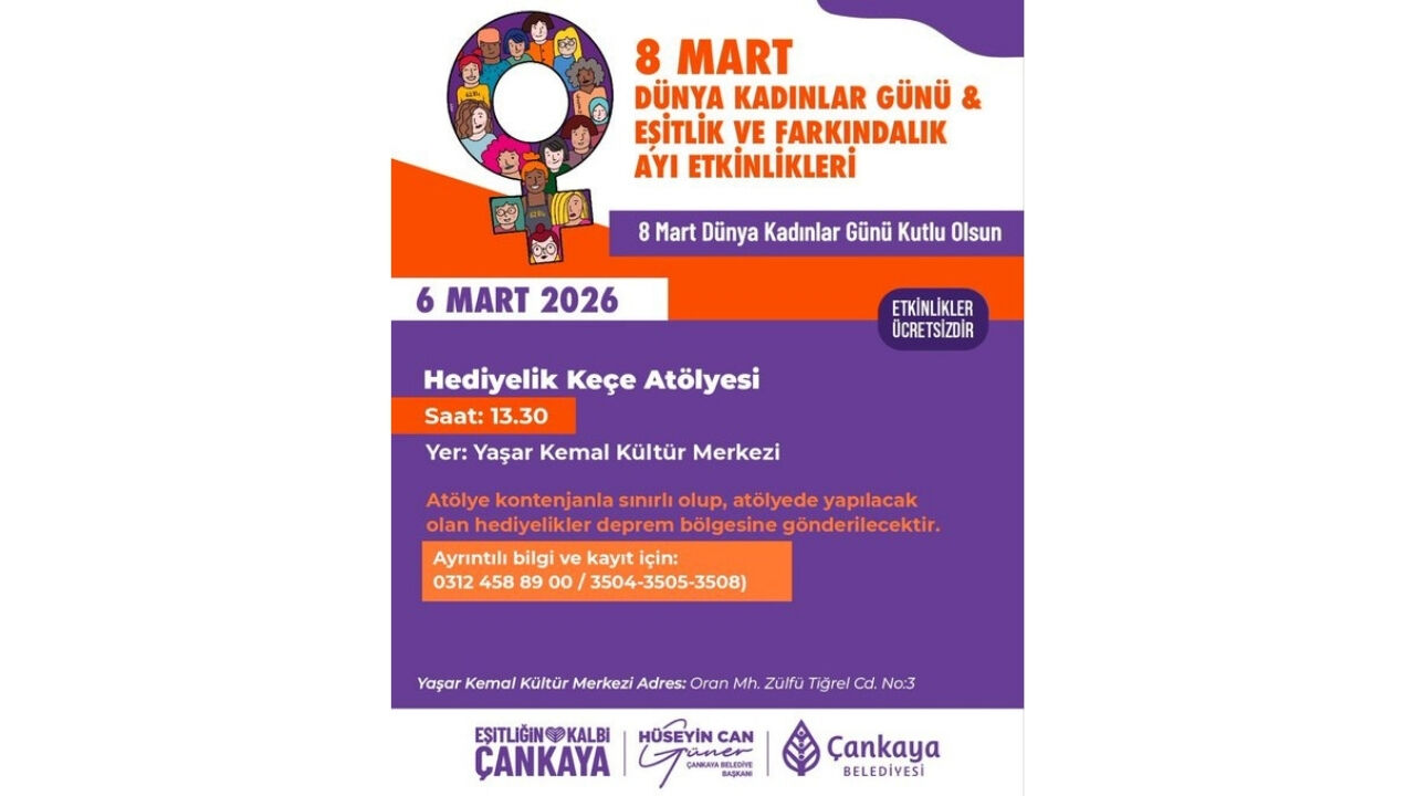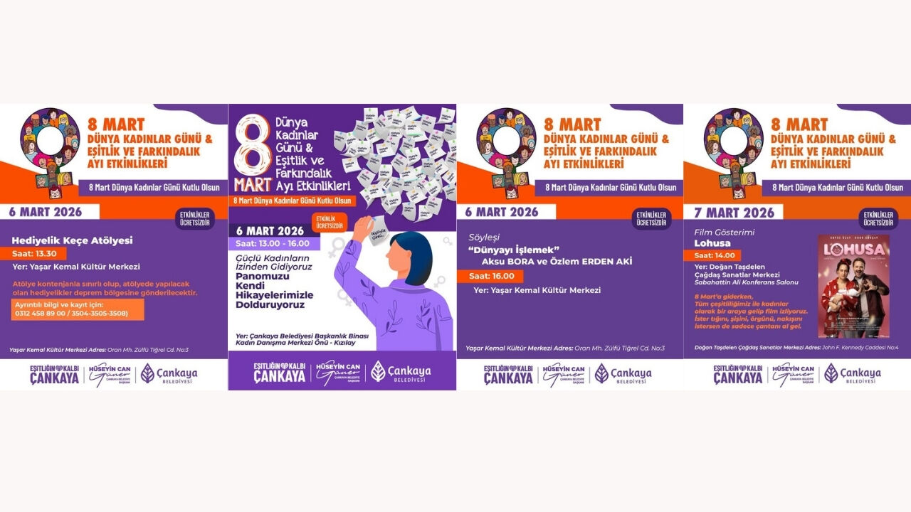 Çankaya Belediyesi, 8 Mart Dünya Kadınlar Günü ve Eşitlik ve Farkındalık Ayı kapsamında planladığı etkinlik takvimini açıkladı. 6 ve 7 Mart 2026 tarihlerinde gerçekleşecek programda Hediyelik Keçe Atölyesi, ‘Güçlüyüz, Çünkü’ panosu buluşması, ‘Dünyayı İşlemek’ söyleşisi ve Lohusa film gösterimi yer alıyor.
