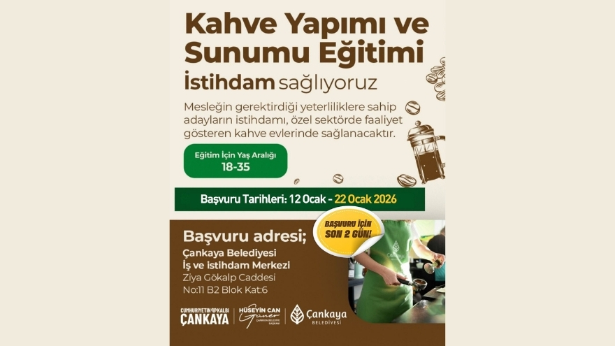 Çankaya Belediyesi sosyal medya hesabından yaptığı paylaşımda Kahve Yapımı ve Sunumu Eğitimleri için başvuruların sürdüğünü duyurdu. Paylaşımda, "Kahve Yapımı ve Sunumu Eğitimlerimiz için başvurular devam ediyor, son 2 gün!" ifadelerine yer verildi.