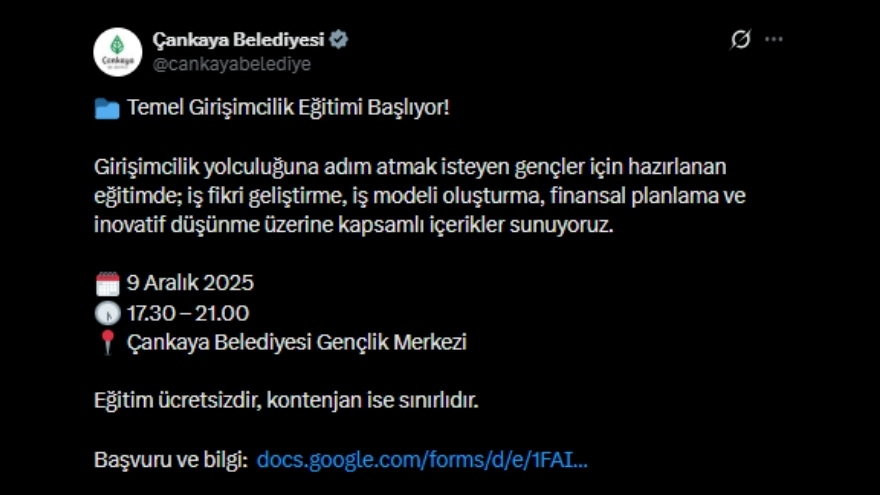 Eğitim, 9 Aralık 2025 Salı günü saat 17:30 ile 21:00 arasında Çankaya Belediyesi Gençlik Merkezi’nde yapılacak.