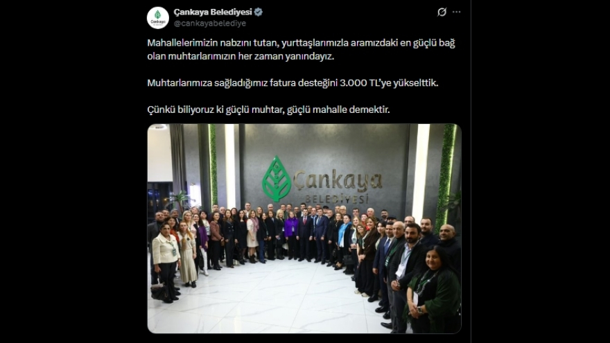 Paylaşımda yer alan bilgilere göre, Çankaya Belediyesi tarafından muhtarlara sağlanan fatura desteği artırıldı. Bu kapsamda destek tutarı 3 bin TL’ye yükseltildi.