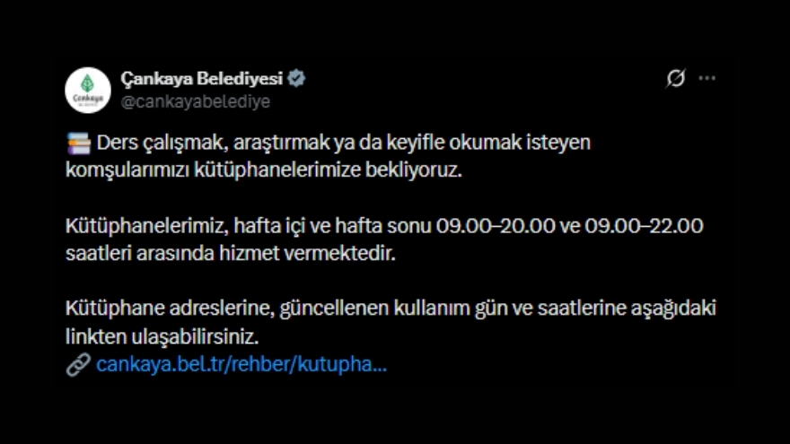 Başkentte ders çalışmak, araştırma yapmak ya da sakin bir ortamda kitap okumak isteyenler için Çankaya Belediyesi’nden önemli bir duyuru geldi. Belediye, kütüphanelerin güncel kullanım gün ve saatlerine ilişkin bilgileri sosyal medya hesabı üzerinden kamuoyuyla paylaştı. Yapılan açıklamada, tüm komşular kütüphanelere davet edildi.