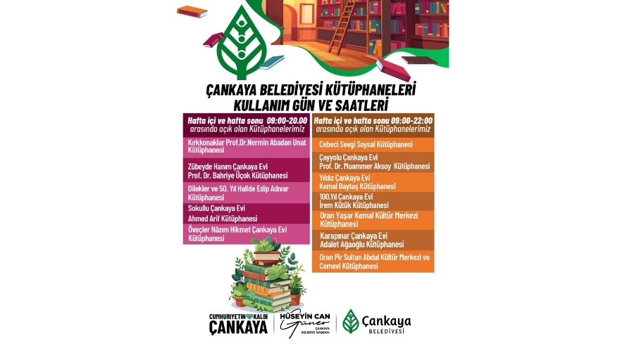 09:00–22:00 saatleri aralığında hizmet veren kütüphaneler ise Cebeci Sevgi Soysal Kütüphanesi, Çayyolu Çankaya Evi Prof. Dr. Muammer Aksoy Kütüphanesi, Yıldız Çankaya Evi Kemal Baytaş Kütüphanesi, 100. Yıl Çankaya Evi İrem Kütük Kütüphanesi, Oran Yaşar Kemal Kültür Merkezi Kütüphanesi, Karapınar Çankaya Evi Adalet Ağaoğlu Kütüphanesi ile Oran Pir Sultan Abdal Kültür Merkezi ve Cemevi Kütüphanesi oldu.