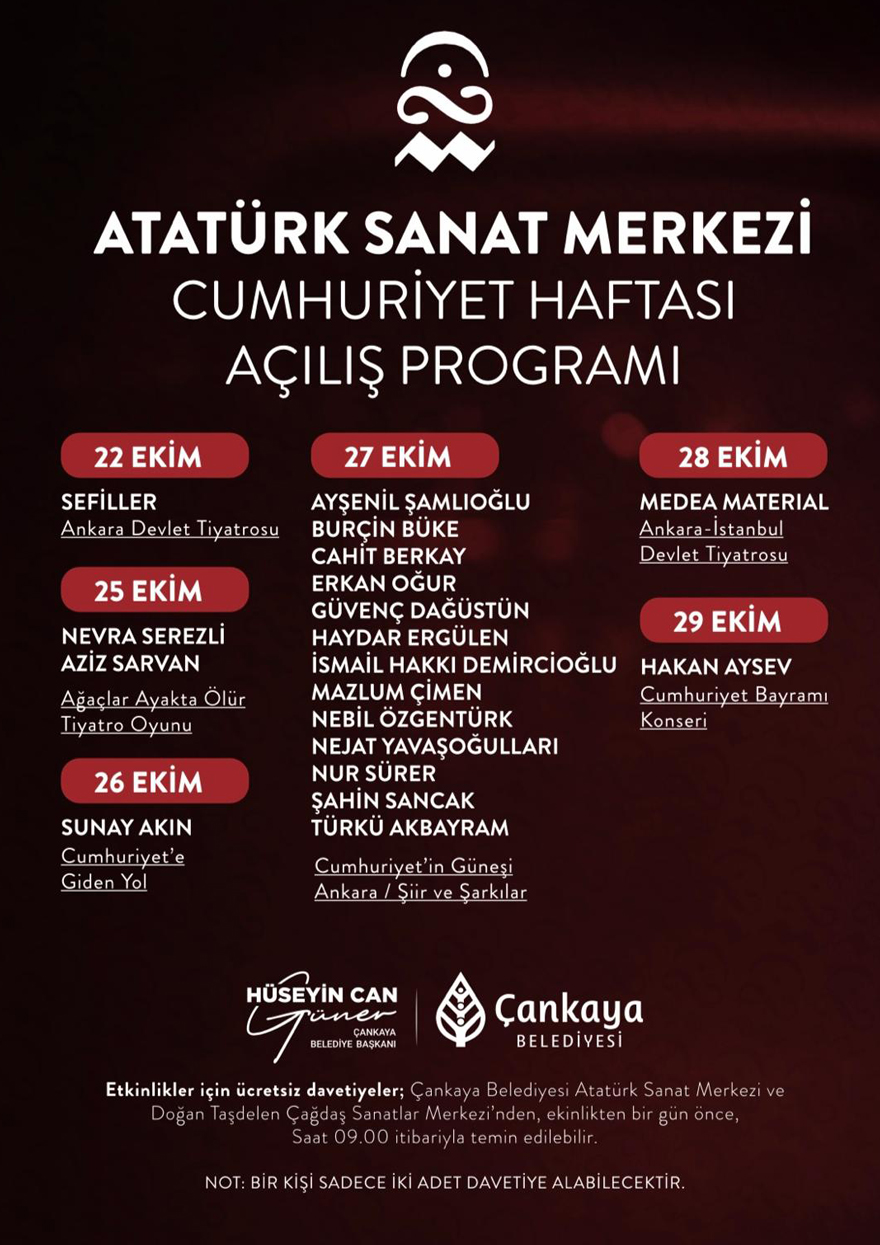 Cumhuriyet Haftası boyunca düzenlenecek diğer etkinliklerin davetiyeleri de, etkinliklerden bir gün önce saat 09.00’dan itibaren Atatürk Sanat Merkezi ve Çağdaş Sanatlar Merkezi’nden alınabilecek.