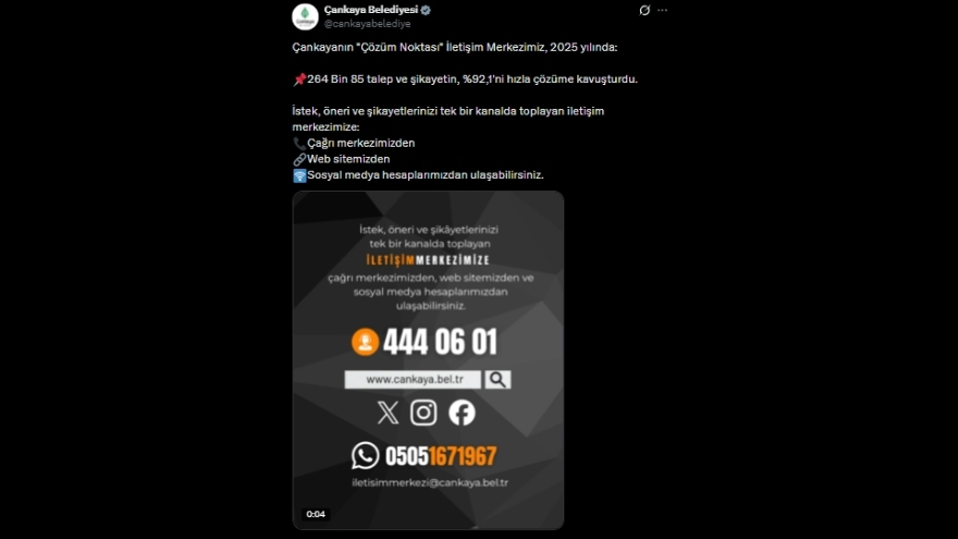 “Çankayanın Çözüm Noktası İletişim Merkezimiz, 2025 yılında: 264 Bin 85 talep ve şikayetin, %92,1'ni hızla çözüme kavuşturdu. İstek, öneri ve şikayetlerinizi tek bir kanalda toplayan iletişim merkezimize: Çağrı merkezimizden, Web sitemizden, Sosyal medya hesaplarımızdan ulaşabilirsiniz.”