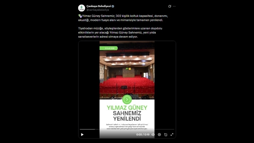 Belediye tarafından paylaşılan tanıtım videosunda, sahnenin yenilenme sürecine ilişkin bilgilere yer verildi. Videoda, “Sahnenin teknik ve mekansal koşullarının iyileştirilmesi amacıyla gerçekleştirilen çalışmalar sonrasında sanat merkezimiz yeni yüzüyle Çankayalılarla buluştu” İfadeleri kullanıldı.
