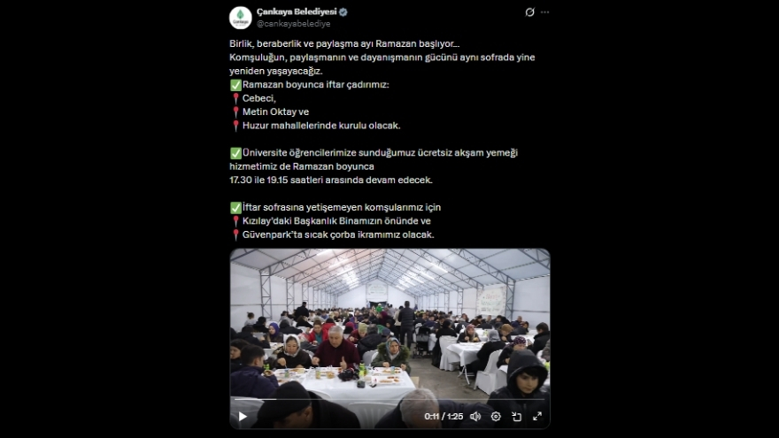 “Birlik, beraberlik ve paylaşma ayı Ramazan başlıyor... Kalplerin yumuşadığı, sofraların çoğaldığı, bir lokmanın bile umut olduğu mübarek ayda Çankaya’da yine yan yanayız... Komşuluğun, paylaşmanın ve dayanışmanın gücünü aynı sofrada yine, yeniden yaşayacağız.”