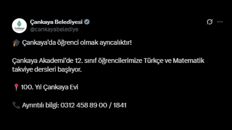 Belediyenin paylaşımında yer alan, “Çankaya’da öğrenci olmak var!” ve “Çankaya Akademi’de 12. sınıf öğrencilerimize Türkçe ve Matematik takviye dersleri başlıyor” ifadeleri, programın öğrencilere sağlanan ücretsiz eğitim destekleri arasına yeni bir halka eklediğini ortaya koyuyor.