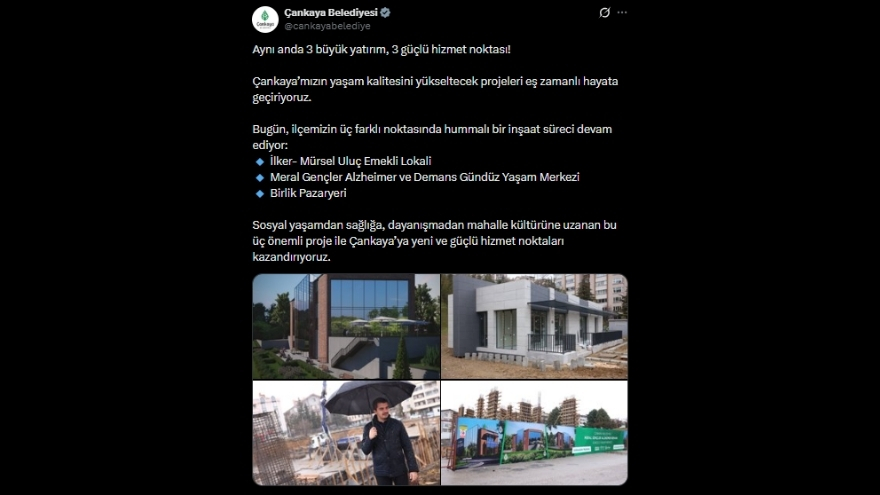 “Aynı anda 3 büyük yatırım, 3 güçlü hizmet noktası! Çankaya’mızın yaşam kalitesini yükseltecek projeleri eş zamanlı hayata geçiriyoruz. Bugün, ilçemizin üç farklı noktasında hummalı bir inşaat süreci devam ediyor: