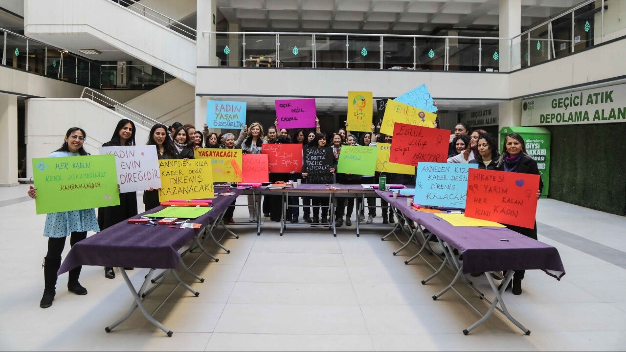 Etkinlikler, Çankaya Belediyesi Başkanlık Binası avlusunda düzenlenen döviz atölyesiyle başladı. Kadınlar, çalışma arkadaşlarıyla birlikte toplumsal cinsiyet eşitliğini simgeleyen dövizler hazırladı. Yaşar Kemal Kültür Merkezi’nde ise Hediyelik Keçe Atölyesi’nde el emeği ürünler hazırlandı ve deprem bölgesindeki kız çocuklarına gönderildi.