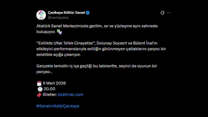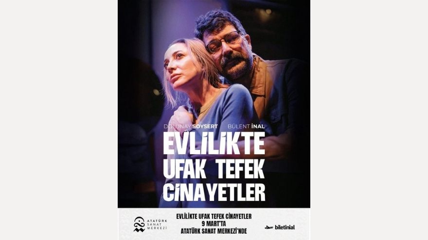 Çankaya Atatürk Sanat Merkezi, Mart ayında tiyatroseverleri sürükleyici bir deneyime davet ediyor. Dolunay Soysert ve Bülent İnal’ın başrollerini paylaştığı ‘Evlilikte Ufak Tefek Cinayetler’, evlilikteki sırlar, yalanlar ve görünmeyen çatlakları sahneye taşıyor.