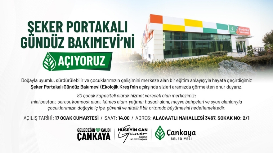 Çankaya Belediyesi, 'Ekolojik Kreş' anlayışıyla projelendirdiği Şeker Portakalı Gündüz Bakımevi’ni 17 Ocak Cumartesi günü düzenlenen törenle hizmete açıldı.