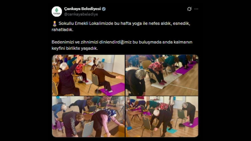 Çankaya Belediyesi sosyal medya hesabında yapılan paylaşımda, "Sokullu Emekli Lokalimizde bu hafta yoga ile nefes aldık, esnedik, rahatladık. Bedenimizi ve zihnimizi dinlendirdiğimiz bu buluşmada anda kalmanın keyfini birlikte yaşadık" ifadelerine yer verildi.