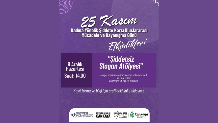 Çankaya’da gençler, 25 Kasım Kadına Yönelik Şiddete Karşı Uluslararası Mücadele ve Dayanışma Günü kapsamında şiddetsiz iletişim konusundaki farkındalıklarını artıracak. TED Üniversitesi’nde düzenlenecek “Şiddetsiz Slogan Atölyesi” ile üniversiteli gençler, kapsayıcı ve yaratıcı sloganlar üretme fırsatı bulacak.
