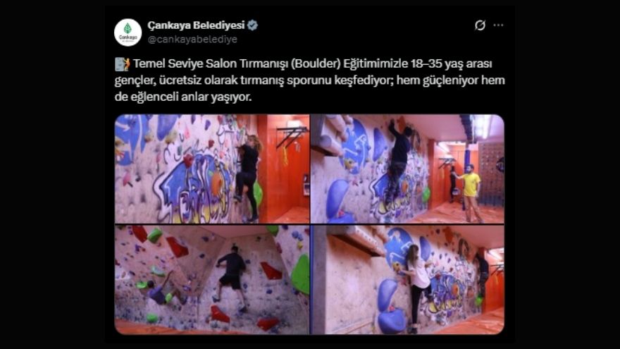 Çankaya Belediyesi, sporla ilgilenen gençlerin hem fiziksel hem de mental olarak güçlenmesini desteklemek amacıyla Temel Seviye Salon Tırmanışı (Boulder) Eğitimini hayata geçirdi. Belediye, duyuruyu resmi sosyal medya hesapları üzerinden yaptı.