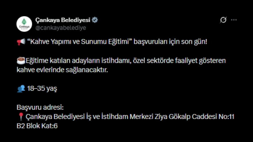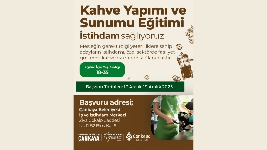 Çankaya Belediyesi’nin duyurusuna göre 'Kahve Yapımı ve Sunumu Eğitimi' için başvurular 17–19 Aralık 2025 tarihleri arasında alındı. Bugün itibarıyla başvuruların son gününe girilirken, belediye yetkilileri ilgilenen adayların geç kalmadan başvuru yapmaları gerektiğini hatırlattı.