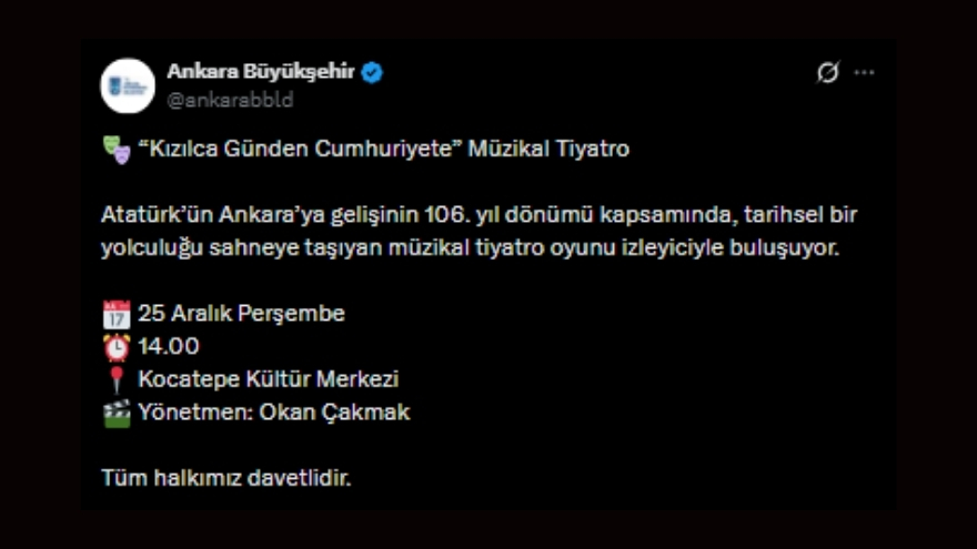 Belediye tarafından yapılan paylaşımda, etkinliğin ücretsiz olduğu belirtilerek “Atatürk’ün Ankara’ya gelişinin 106. yıl dönümü kapsamında, tarihsel bir yolculuğu sahneye taşıyan müzikal tiyatro oyunu izleyiciyle buluşuyor. Tüm halkımız davetlidir” ifadesiyle Ankaralılara çağrıda bulunuldu.