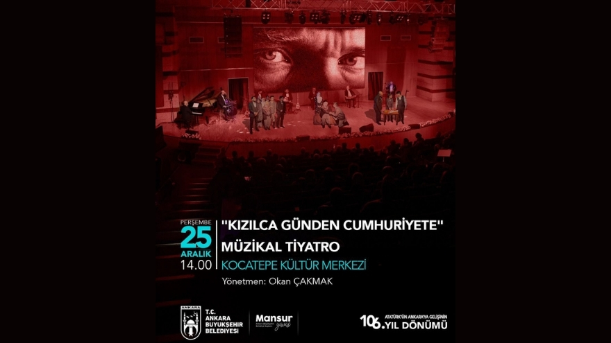 Çankaya Belediyesi, Atatürk’ün Ankara’ya gelişinin 106. yıl dönümünü anlamlı bir kültür-sanat etkinliğiyle anıyor. Belediyenin sosyal medya hesaplarından yapılan duyuruya göre, tarihsel bir yolculuğu sahneye taşıyan ‘Kızılca Günden Cumhuriyete’ adlı müzikal tiyatro oyunu, başkentli sanatseverlerle buluşacak.