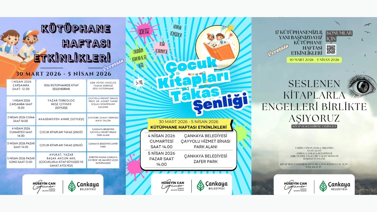 Çankaya Belediyesi, Kütüphane Haftası kapsamında ilçedeki 17 farklı kütüphanede her yaştan vatandaşa ulaşan etkinlikler düzenleyerek dikkat çekiyor. 30 Mart - 5 Nisan 2026 tarihleri arasında gerçekleştirilen programda söyleşiler, atölyeler ve çocuklara yönelik etkinlikler yer alırken, kütüphaneler ücretsiz hizmetleri ve 7/24 açık alanlarıyla da yoğun ilgi görüyor. Farklı yaş gruplarını kitap ve kültürle buluşturmayı hedefleyen etkinlikler, ilçe genelinde kütüphaneleri haftaya özel bir buluşma noktasına dönüştürüyor.