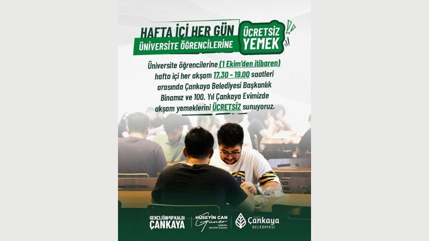 Ücretsiz akşam yemekleri, üniversite öğrencileri için iki farklı noktada sunulacak. Öğrenciler, Çankaya Belediyesi Başkanlık Binası Yemekhanesi ile 100. Yıl Çankaya Evi Yemekhanesi’nde hafta içi her akşam 17:30 – 19:00 saatleri arasında ücretsiz olarak akşam yemeklerine erişebilecek.