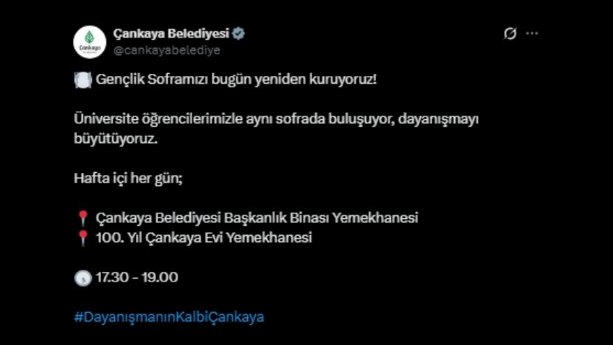 Çankaya Belediyesi, üniversite öğrencilerini aynı sofrada buluşturuyor. Sosyal dayanışmayı güçlendirmek ve gençlerin yanında olmak amacıyla başlatılan uygulama, hafta içi her gün 17:30 – 19:00 saatleri arasında ücretsiz yemek imkanı sunuyor.