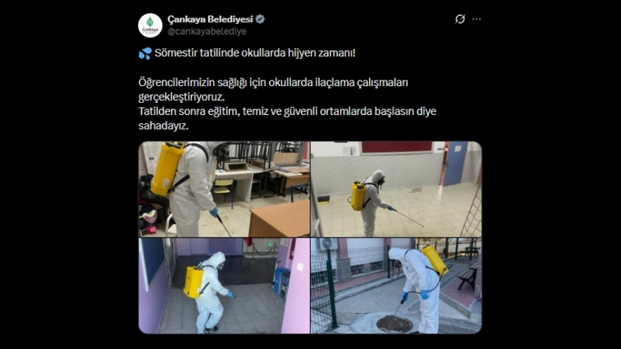 Çankaya Belediyesi, yarıyıl tatilini fırsata çevirerek ilçedeki okullarda kapsamlı hijyen çalışmaları başlattı. Belediyenin sosyal medya hesabı üzerinden yapılan açıklamada, öğrencilerin sağlığını korumaya yönelik ilaçlama çalışmalarının tatil süresince sürdürüldüğü bildirildi.