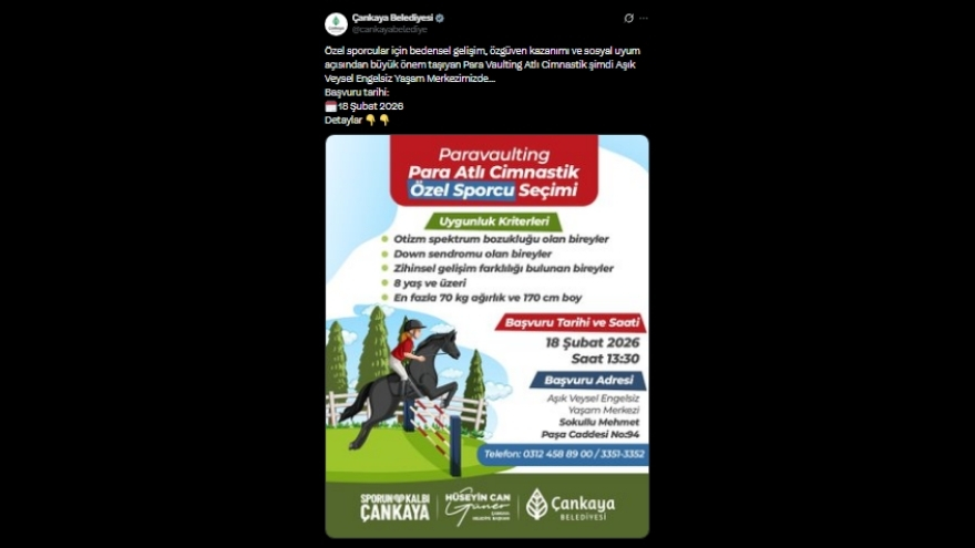 Çankaya Belediyesi sosyal medya hesabından yapılan duyuruyla özel sporculara yönelik yeni bir spor çalışması kamuoyuna duyuruldu.