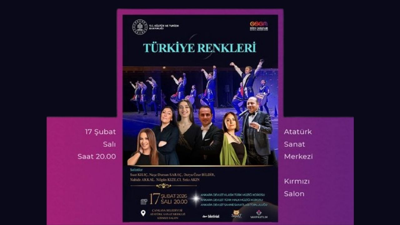 Etkinlik 17 Şubat Salı günü saat 20:00’de Atatürk Sanat Merkezi Kırmızı Salon’da gerçekleştirilecek. Detaylı bilgilere ankarasahnesanat.ktb.gov.tr adresi üzerinden, biletlere ise biletinial.com/tr-tr/muzik/turkiye-renkleri-konseri adresi üzerinden ulaşabilirsiniz.