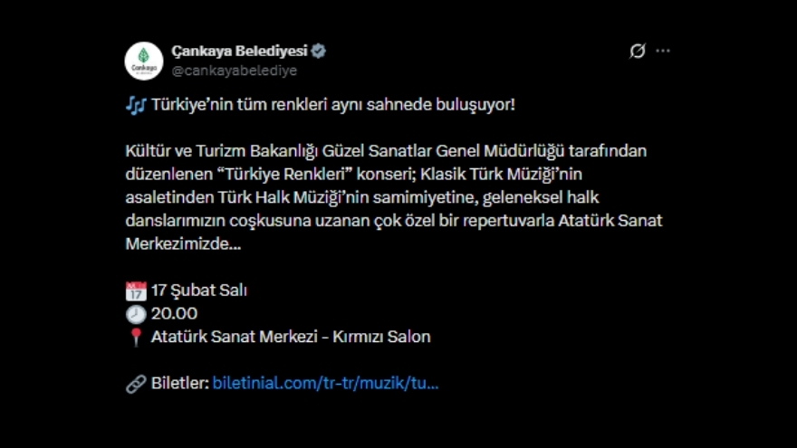 “Türkiye’nin tüm renkleri aynı sahnede buluşuyor! Kültür ve Turizm Bakanlığı Güzel Sanatlar Genel Müdürlüğü tarafından düzenlenen ‘Türkiye Renkleri’ konseri; Klasik Türk Müziği’nin asaletinden Türk Halk Müziği’nin samimiyetine, geleneksel halk danslarımızın coşkusuna uzanan çok özel bir repertuvarla Atatürk Sanat Merkezimizde...”