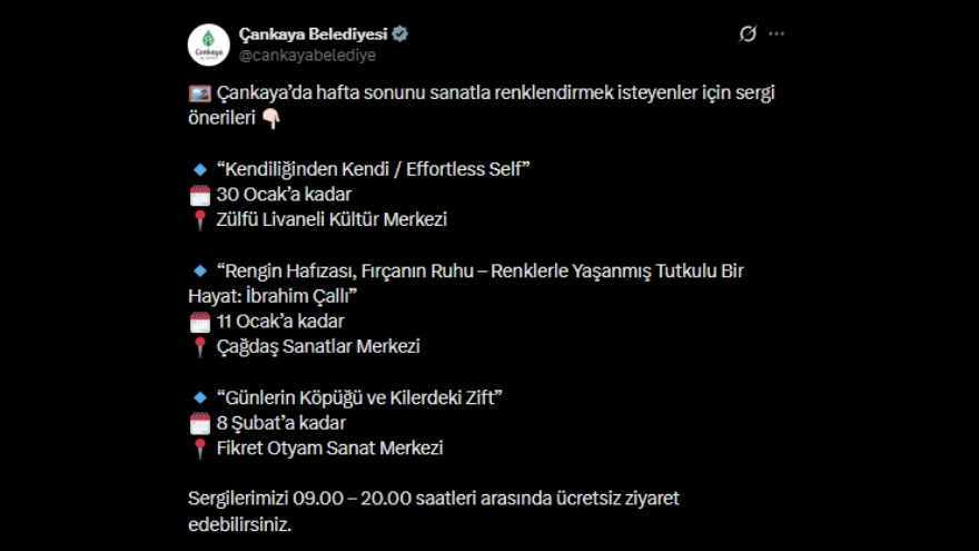 Çankaya Belediyesi, hafta sonunu kültür ve sanatla geçirmek isteyen Ankaralılara sosyal medya hesabı üzerinden çağrıda bulundu. Başkentin sanat hafızasında önemli yeri olan sergilerle, Çankaya bir kez daha sanatı herkes için erişilebilir kılıyor.