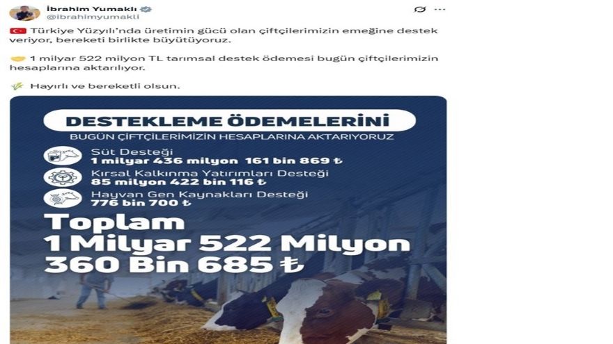 Tarım ve Orman Bakanı İbrahim Yumaklı, sosyal medya hesabından tarımsal destekleme ödemelerine ilişkin paylaşımda bulundu.
