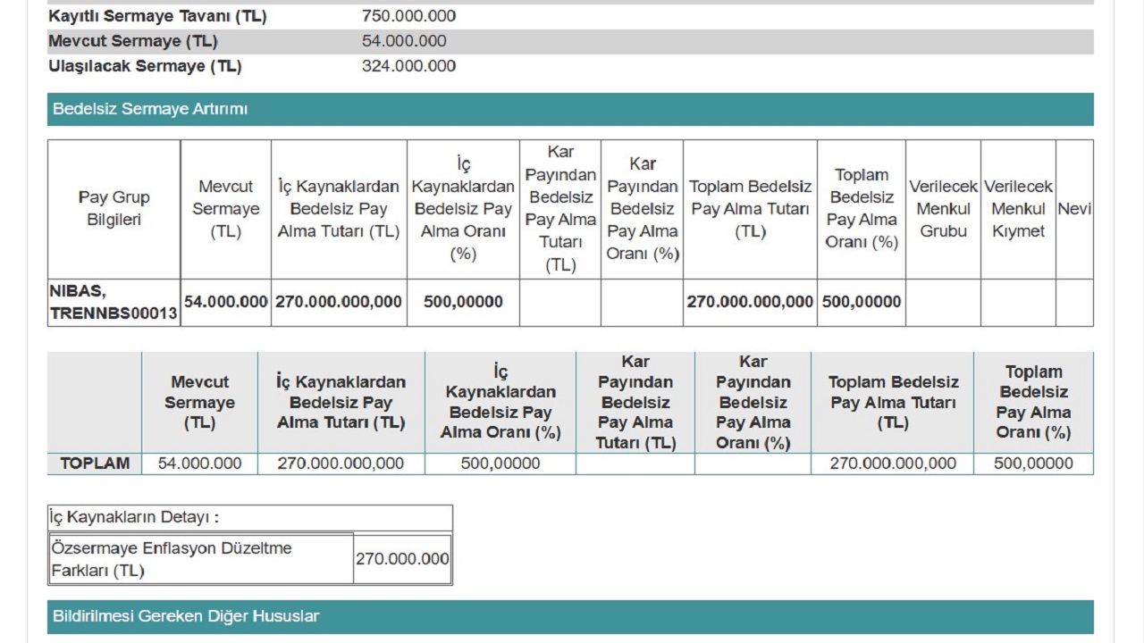 750 milyon TL kayıtlı sermaye tavanı içerisinde kalınarak gerçekleştirilmesi planlanan bedelsiz sermaye artırımı ile birlikte, portföyünde NIBAS hisse olan yatırımcılara yeni ücretsiz lotlar verilecek. Elinde 1 lot NIBAS pay senedi olan yatırımcılar, 5 lot da yeni hisse alacak ve toplamda 6 lotları olacak.