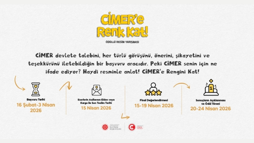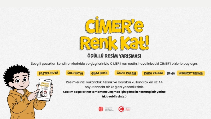 Çocukların hayal gücünü sanatla ifade etmelerine imkan tanıyan yeni bir yarışma duyuruldu. Türkiye Cumhuriyeti Cumhurbaşkanlığı İletişim Başkanlığı tarafından yapılan sosyal medya paylaşımıyla tanıtılan ‘CİMER’e Renk Kat’ ödüllü resim yarışması, ilkokul ve ortaokul öğrencilerini hayallerindeki CİMER’i resmetmeye davet ediyor.
