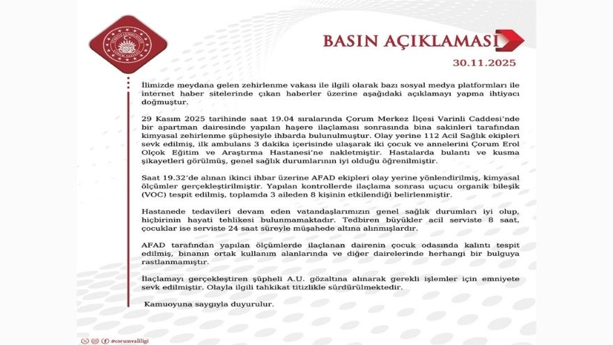 Yapılan açıklamada, "İlimizde meydana gelen zehirlenme vakası ile ilgili olarak bazı sosyal medya platformları ile internet haber sitelerinde çıkan haberler üzerine aşağıdaki açıklamayı yapma ihtiyacı doğmuştur. 29 Kasım 2025 tarihinde saat 19.04 sıralarında Çorum Merkez ilçesi Varlıklı Caddesi’nde bir apartman dairesinde yapılan haşere ilaçlaması sonrasında bina sakinleri tarafından kimyasal zehirlenme şüphesiyle ihbarda bulunulmuştur. Olay yerine 112 Acil Sağlık ekipleri sevk edilmiş, ilk ambulans 3 dakika içerisinde ulaşarak iki çocuk ve annelerini Çorum Erol Olçok Eğitim ve Araştırma Hastanesi’ne nakletmiştir. Hastalarda bulantı ve kusma şikayetleri görülmüş, genel sağlık durumlarının iyi olduğu öğrenilmiştir. Saat 19.32’de alınan ikinci ihbar üzerine AFAD ekipleri olay yerine yönlendirilmiş, kimyasal ölçümler gerçekleştirilmiştir. Yapılan kontrollerde ilaçlama sonrası uçucu organik bileşik (VOC) tespit edilmiş, toplamda 3 aileden 8 kişinin etkilendiği belirlenmiştir. Hastanede tedavileri devam eden vatandaşlarımızın genel sağlık durumları iyi olup, hiçbirinin hayati tehlikesi bulunmamaktadır. Tedbiren büyükler acil serviste 8 saat, çocuklar ise serviste 24 saat süreyle müşahede altına alınmışlardır. AFAD tarafından yapılan ölçümlerde ilaçlanan dairenin olduğu katta tespit edilen birim, binanın ortak kullanım alanlarında ve diğer dairelerde herhangi bir olumsuzluğa rastlanmamıştır. İlaçlamayı gerçekleştiren şüpheli A.U. gözaltına alınarak gerekli işlemler için emniyete sevk edilmiştir. Olayla ilgili tahkikat titizlikle sürdürülmektedir" denildi.