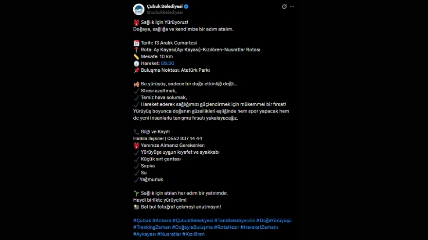 Çubuk Belediyesi tarafından sosyal medya üzerinden yapılan paylaşım ile duyurulan etkinlikte, doğayla iç içe bir gün geçirmek isteyen vatandaşlar için rota açıklandı.
