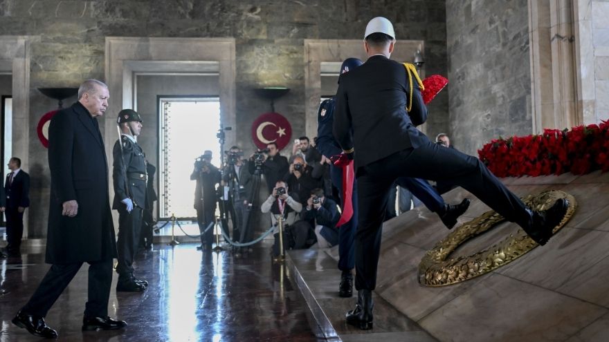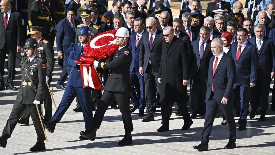 Cumhurbaşkanı Erdoğan'ın, üzerinde ay yıldız bulunan çelengi Atatürk'ün mozolesine bırakmasının ardından saygı duruşunda bulunuldu ve İstiklal Marşı okundu.